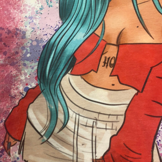 Custom distressed jean jacket with Karol g image.